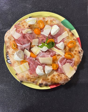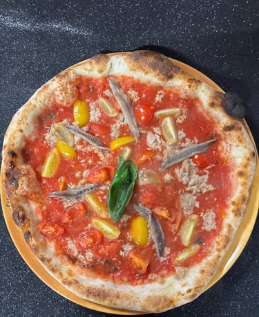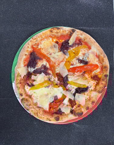 Pomodoro, mozzarella, peperoni, cipolle caramellate, 'nduja, scaglie di grana.