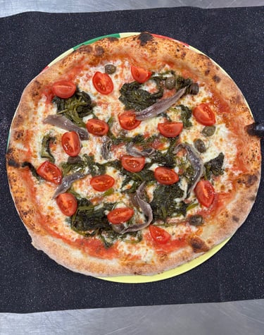 Pomodoro, mozzarella, cime di rapa, olive taggiasche, acciuga, pomodorini