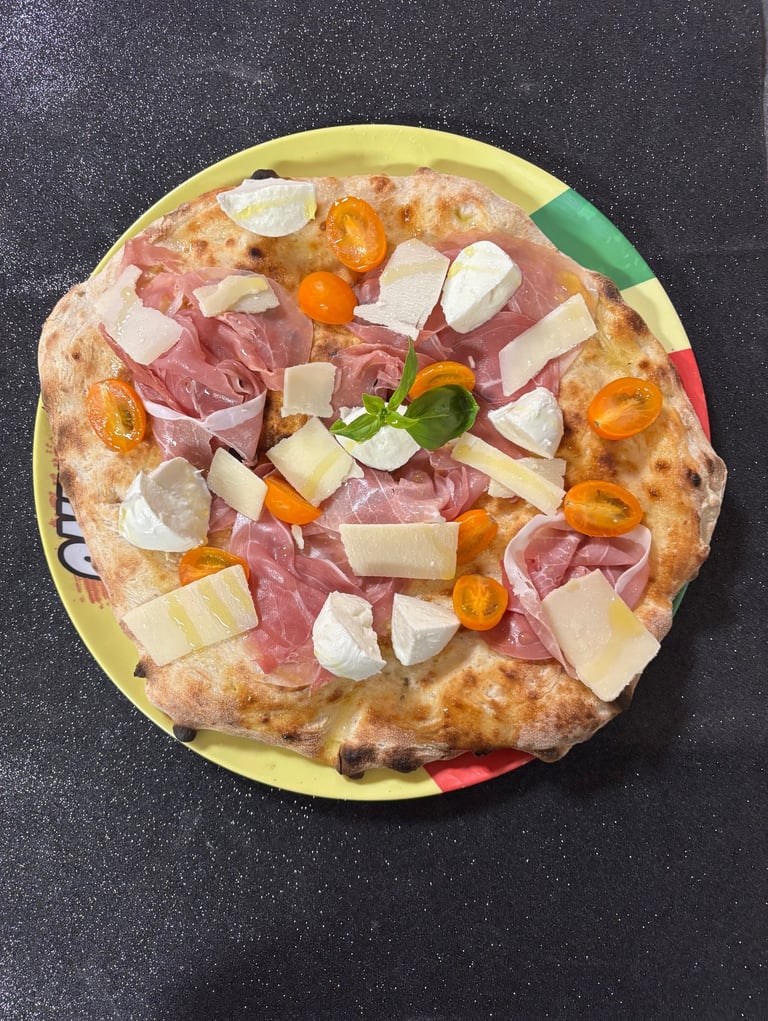 Mozzarella di bufala, pomodorini gialli, crudo, scaglie di grana, olio Evo.
