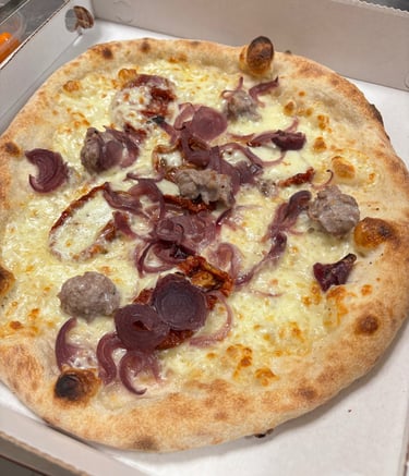 Mozzarella, pomodorini secchi, salsiccia, cipolla caramellata, olio EVO.